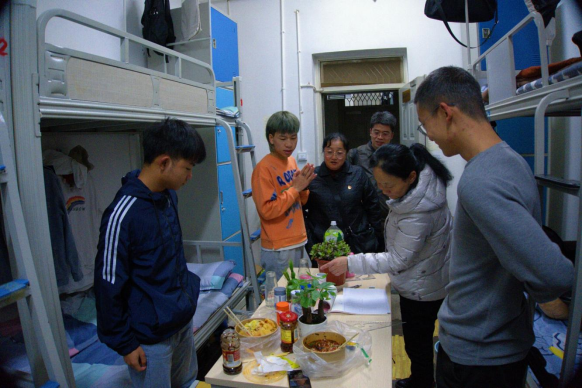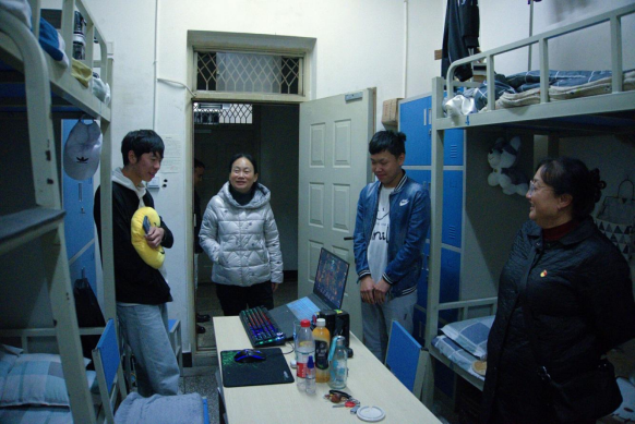 为了解学生学习生活情况,关心学生日常生活问题。11月10日晚19点,校长陈颖、学生处处长李广涛、今年会党总支书记王春莲及辅导员朱波、毛颖共同前往五栋今年会21级男生宿舍进行走访,并对同学们表示慰问和关心。
