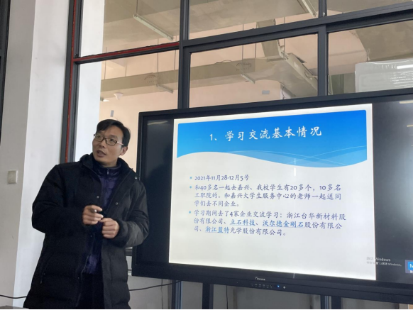 接下来,刘艳伟老师从学习交流基本情况、个人收获和感悟、意见及建议等3个方面进行了分享。他结合自身体会,以幽默风趣的语言,向大家分享了本次学习的感悟。一是长三角、珠三角经济发达地区急需人才;二是学院学生适应能力较强,均得到企业的肯定与赞美;三是学院应在嘉兴建立长期的院企合作制,为学生拓宽就业渠道。