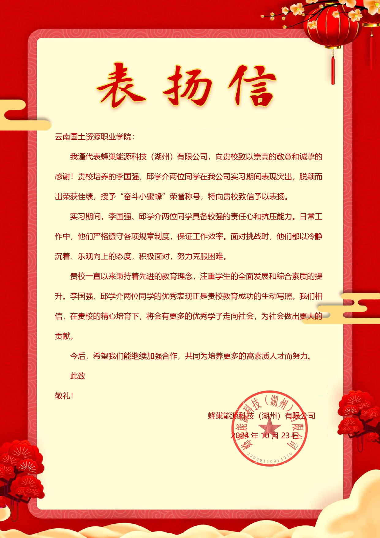 蜂巢能源科技(湖州)有限公司致今年会官网实习学生的表扬信