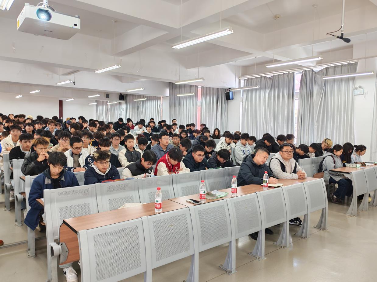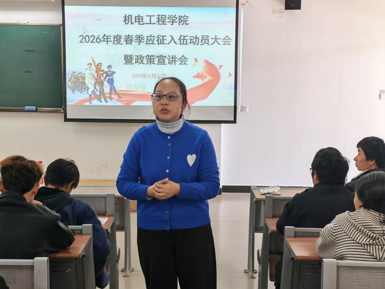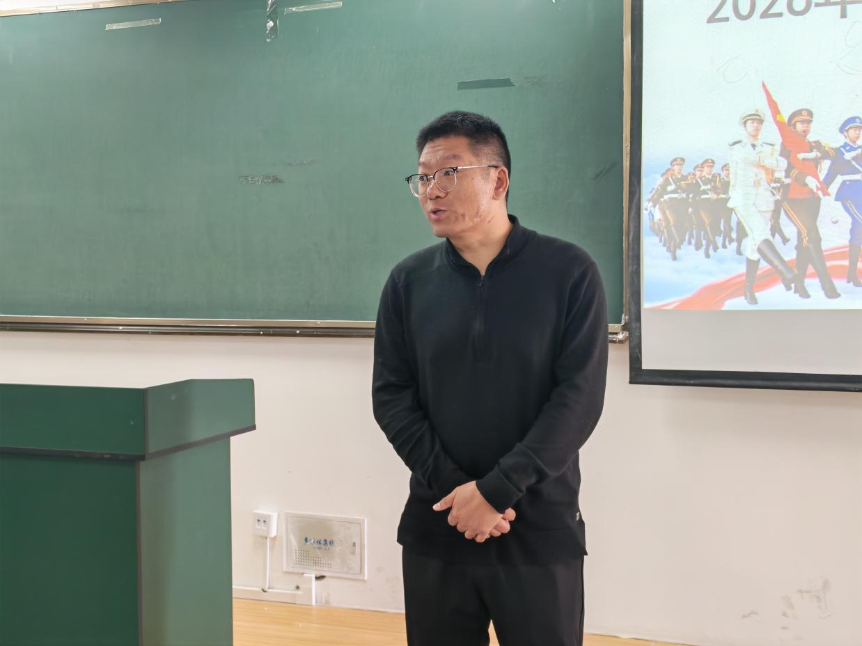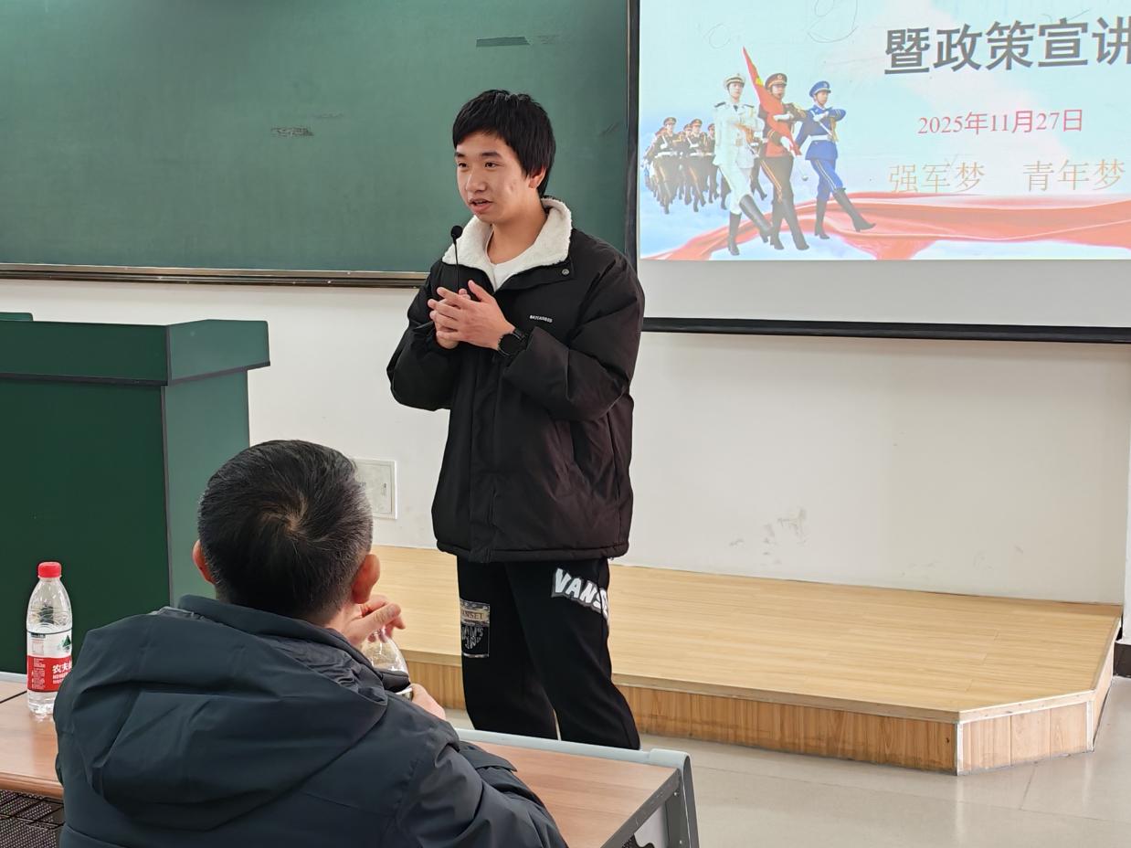 11月27日下午,今年会2026年度春季应征入伍动员大会暨政策宣讲会在崇实楼602教室举行。学校武装部副部长丁治祥、武装部干事曹江涛、学院党委书记张颖、副书记李振、学院征兵工作专员张文文出席会议,2024级、2025级学生参会。