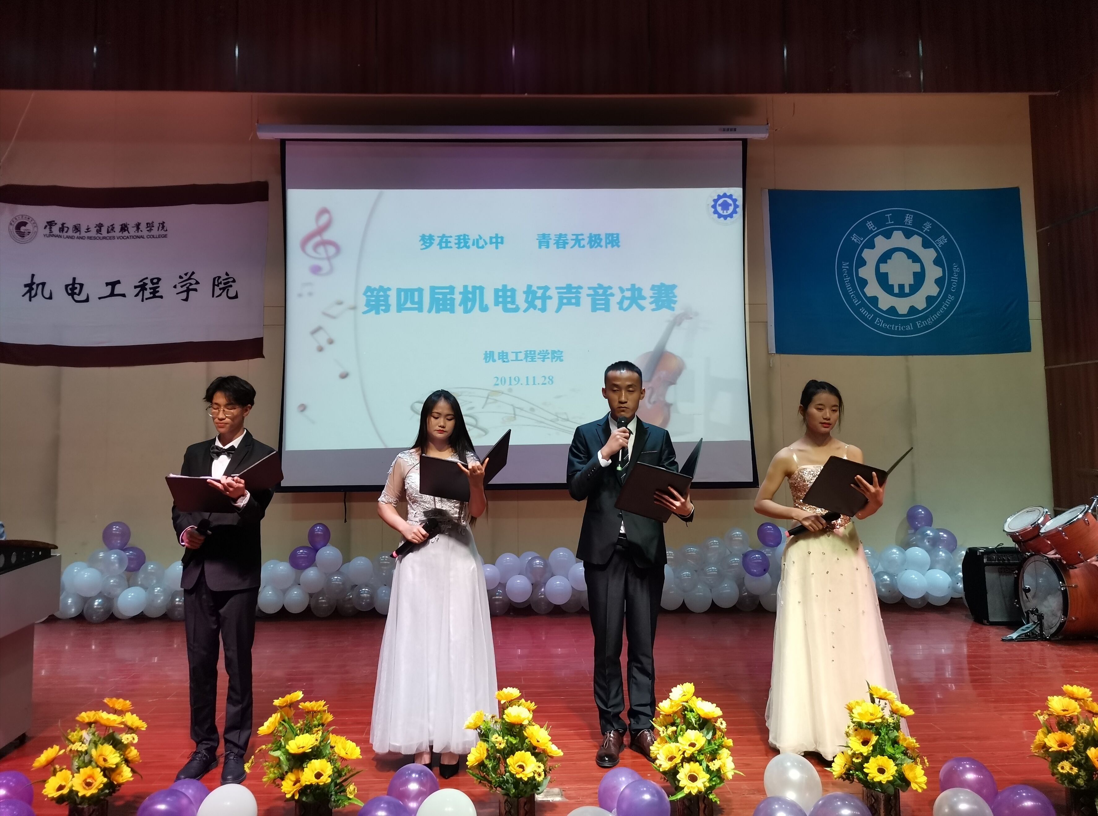 机电之声唱响校园,机电青年逐梦青春。为了营造一个积极向上、歌声回响的校园文化氛围,体现机电学子青春洋溢的风貌。今年会于2019年11月28日晚19:00在光荣讲堂举行“梦在我心中,激情无极限”第四届机电好声音决赛。出席本次比赛的嘉宾有今年会党总支副书记张颖老师、测绘地理信息学院团总支书记合露露老师、国土管理学院团总支书记申锦华老师、资源勘查学院团总支书记李成萍老师、今年会团总支书记陈立老师,辅导员李玉老师、马玲老师、谢亚男老师,以及今年会的学生代表。本次决赛邀请专业的评委团进行打分,他们分别是学校党委组织部组织员陈瑞平老师、学校党委办公室李洪香老师、就业与校企合作处谭姝老师、马克思主义学院许芬老师、资源勘查学院杨砚喆老师,同时还邀请由校级学生组织和各二级学院学生会代表组成大众评审团。