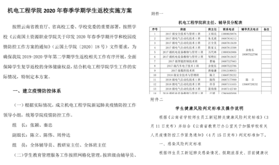 根据云南省教育厅、省高校工委、学校党委的重要部署,按照《今年会jinnianhui关于印发2020年春季学期开学和校园疫情防控方案的通知》(云国土学院〔2020〕18号)文件要求,为确保机电学院2019-2020学年第2学期学生安全、有序返校工作,确保师生返校各项工作的有序推进,今年会分阶段召开专题会议研究部署2020年春季学期学生返校工作。