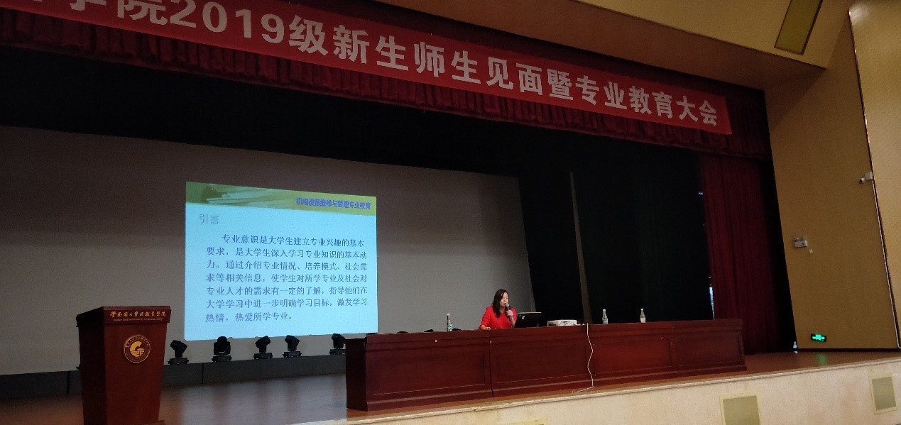 党总支副书记张颖老师致欢迎词并发表讲话,张颖老师一一介绍学院教职工并对2019级新生的加入表示热烈欢迎。张颖老师以“中国梦”为出发点给新生上了开学第一课,提出几点希望:一是树立理想;二是崇实笃行;三是持之以恒;四是充满激情。