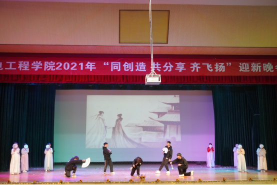本次晚会内容丰富、形式多样,并穿插了滚屏抽奖环节推动现场气氛。新生班级积极参与、精心排练,在舞台上展现出了机电学子们的青春与朝气。带着浓厚红色底蕴的话剧《初心》率先出场,再现了嘉兴南湖的红船上中共一大召开的场景;歌舞剧《身着白衣,心有锦缎》通过时代最美的逆行者演绎了“抗疫”的艰辛与成果;舞蹈《灯火里的中国》以优美的舞姿,展现了对国家富强的赞美与歌颂;小品《刺客与皇帝》打破了正史的严肃,用幽默创新的语言动作引得大家阵阵欢笑;《hiohop舞蹈串烧》以青春活力的舞步赢得观众鼓掌喝彩;《陪你走过的岁月》采用影子秀的方式演绎了一场唯美的校园爱情;蒙古舞《走马》,用铿锵有力的步伐,带领全场观众驰骋草原,感受了自然风光的辽阔。