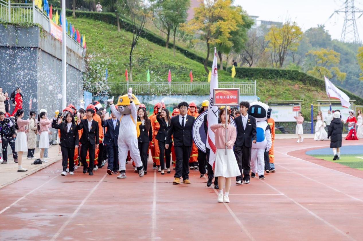 今年会方阵身着特色服装,手持智能机器人整齐入场,尽显青春风采。