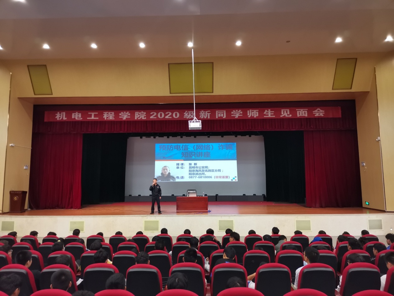 最后,由阳宗派出所教导员张新警官对新生进行防范电信诈骗主题教育,以培养学生自我保护的意识和能力。张警官结合发生在我们身边的诸多真是案例进来分析,如冒充同学、老师、领导、亲人等方式进行诈骗。张警官的讲授风格诙谐幽默,同学们听的很感兴趣,现场气氛活跃,互动性强。对于我们大学生而言,要学习一定的防范诈骗的基本知识,提高防范诈骗的基本能力。