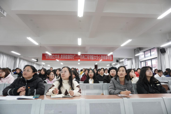接着,韩云萍教授从女生心理现状出发,分析“女生”和“女神”的区别,解答了“什么是女神”。她用幽默风趣的语言和生动形象的事例向同学们传达了成为女神的主要条件是自信、独立、修养、自尊。自信是健康心理的基础,她以著名主持人杨澜为例,结合自身经历,阐述了自信之于女性的重要性;独立是成功的必修课程,她以董明珠切实为员工着想设置相应的管理制度为例,强调了要做思想独立、情感独立、经济独立的“三独立”女性;修养是处事的态度,要像董卿一样成为一个有文化素养有道德涵养有形象修养的人; 自尊是成功的前提,女性要先爱自己、尊重自己才能获得别人的爱慕与尊重。