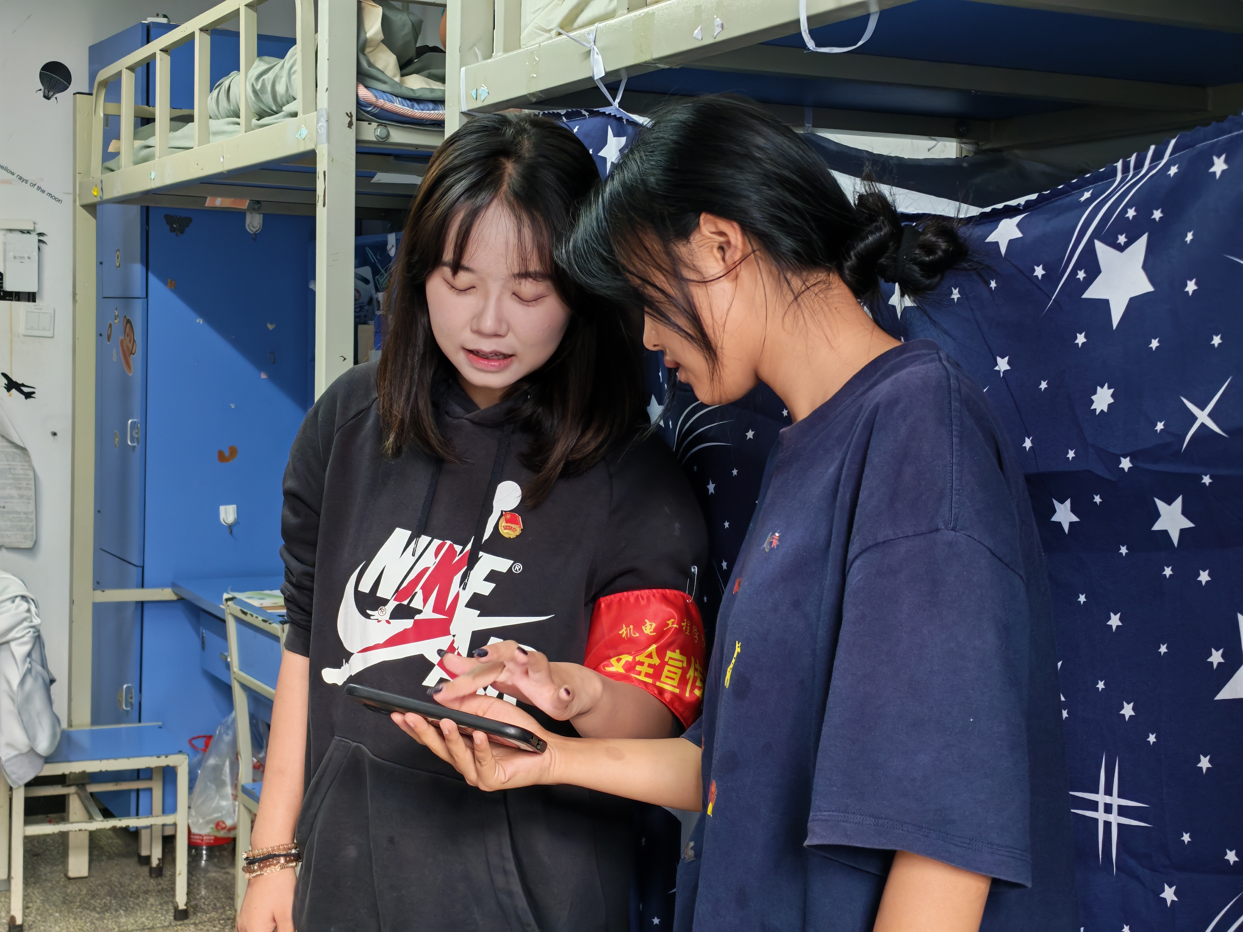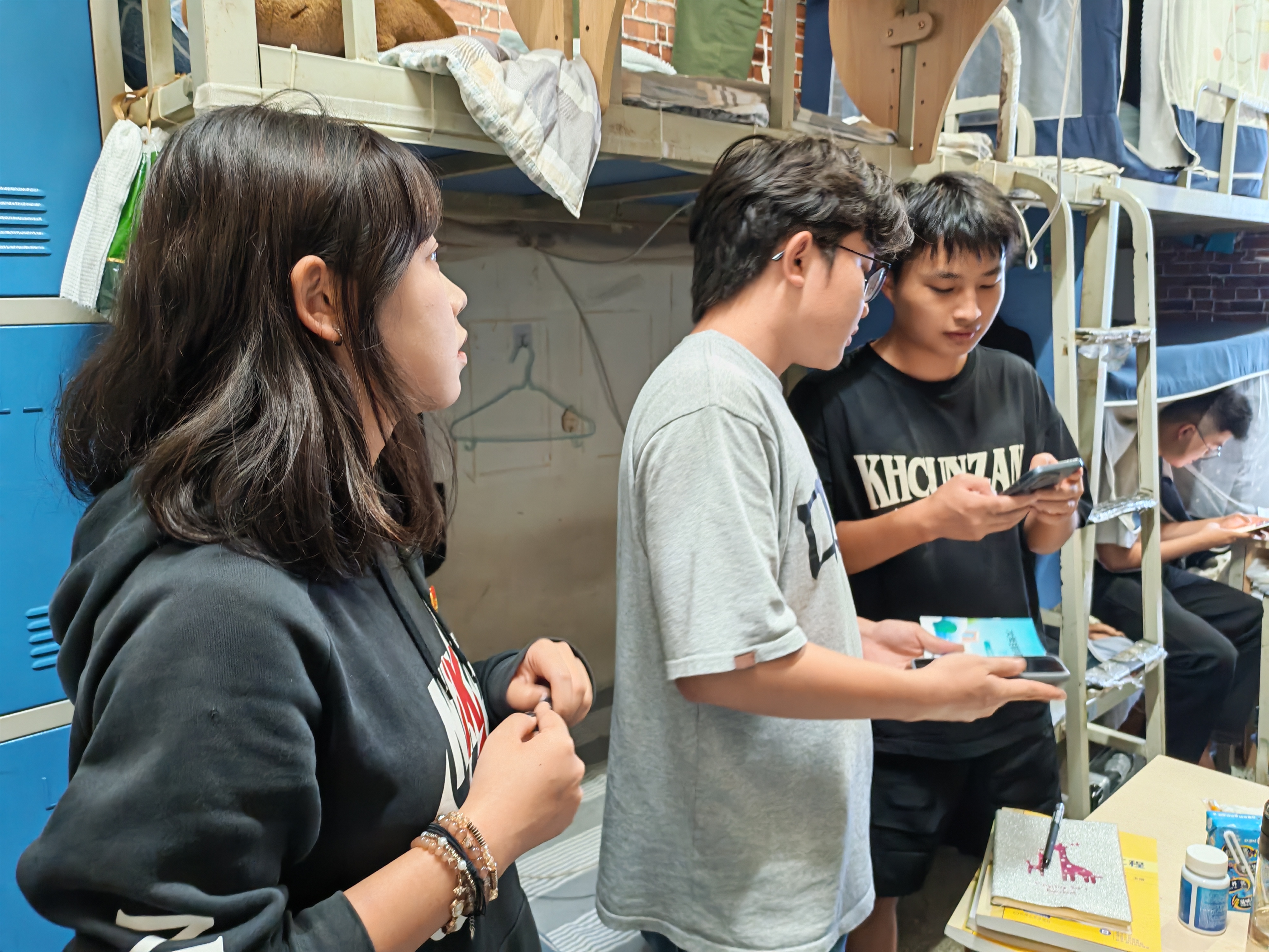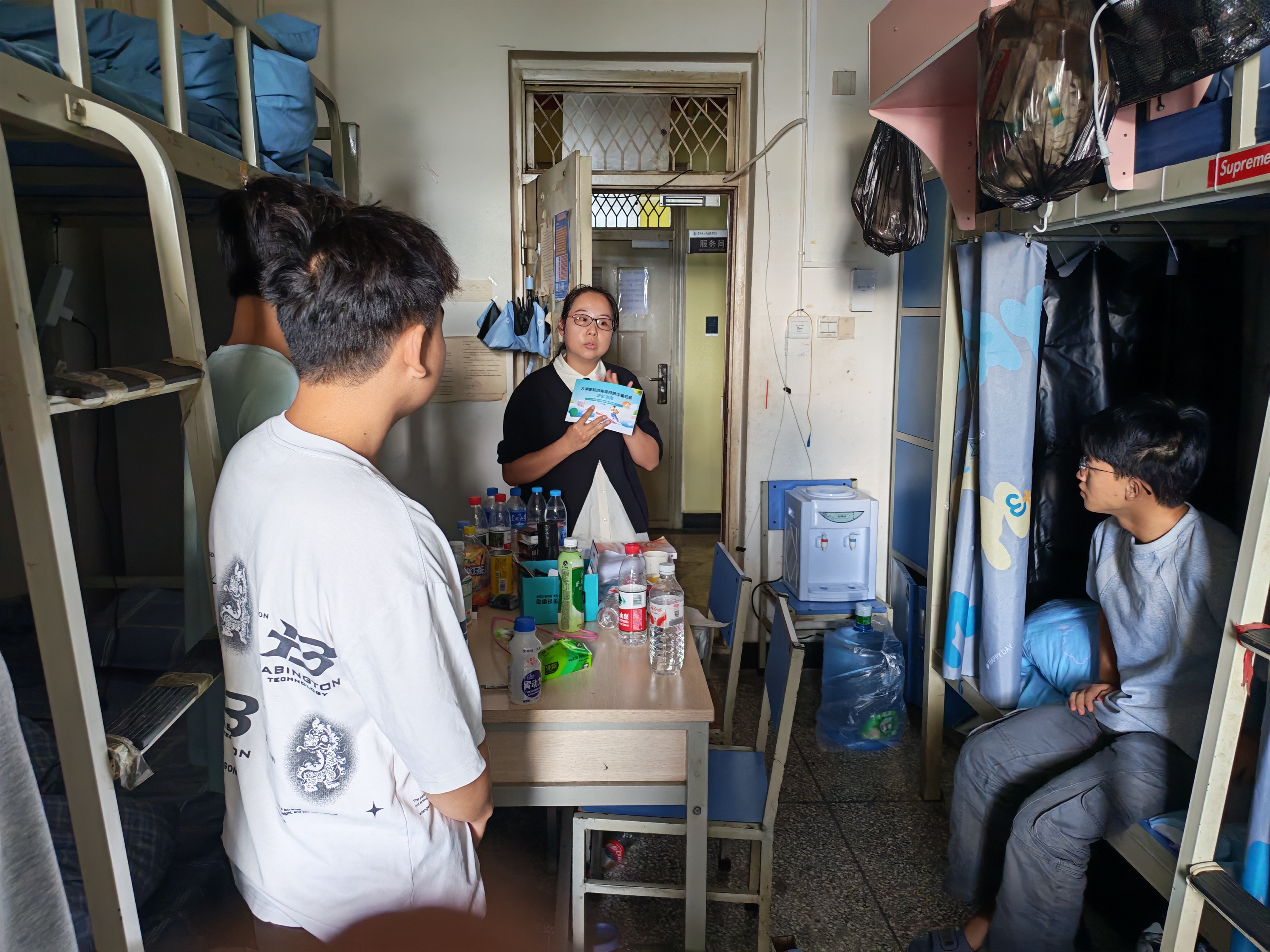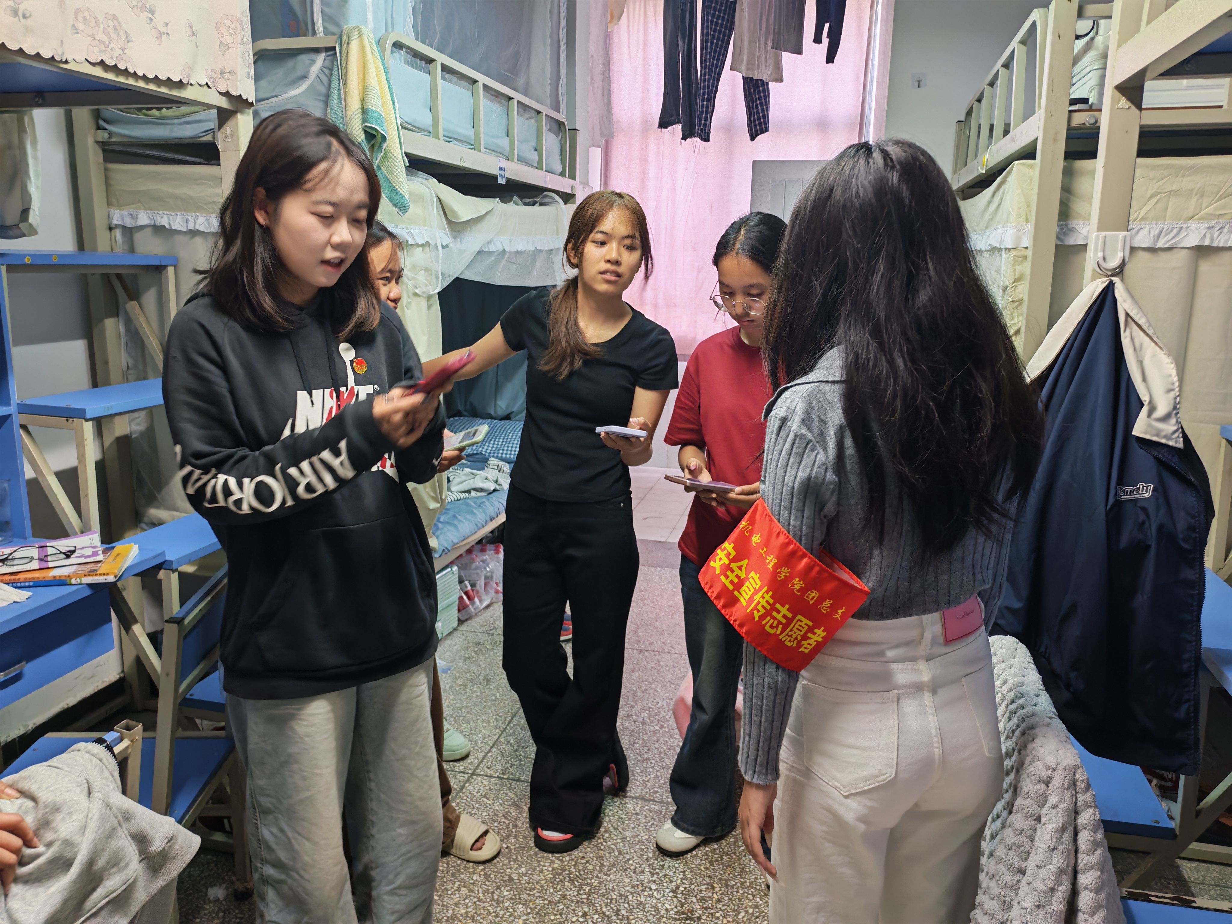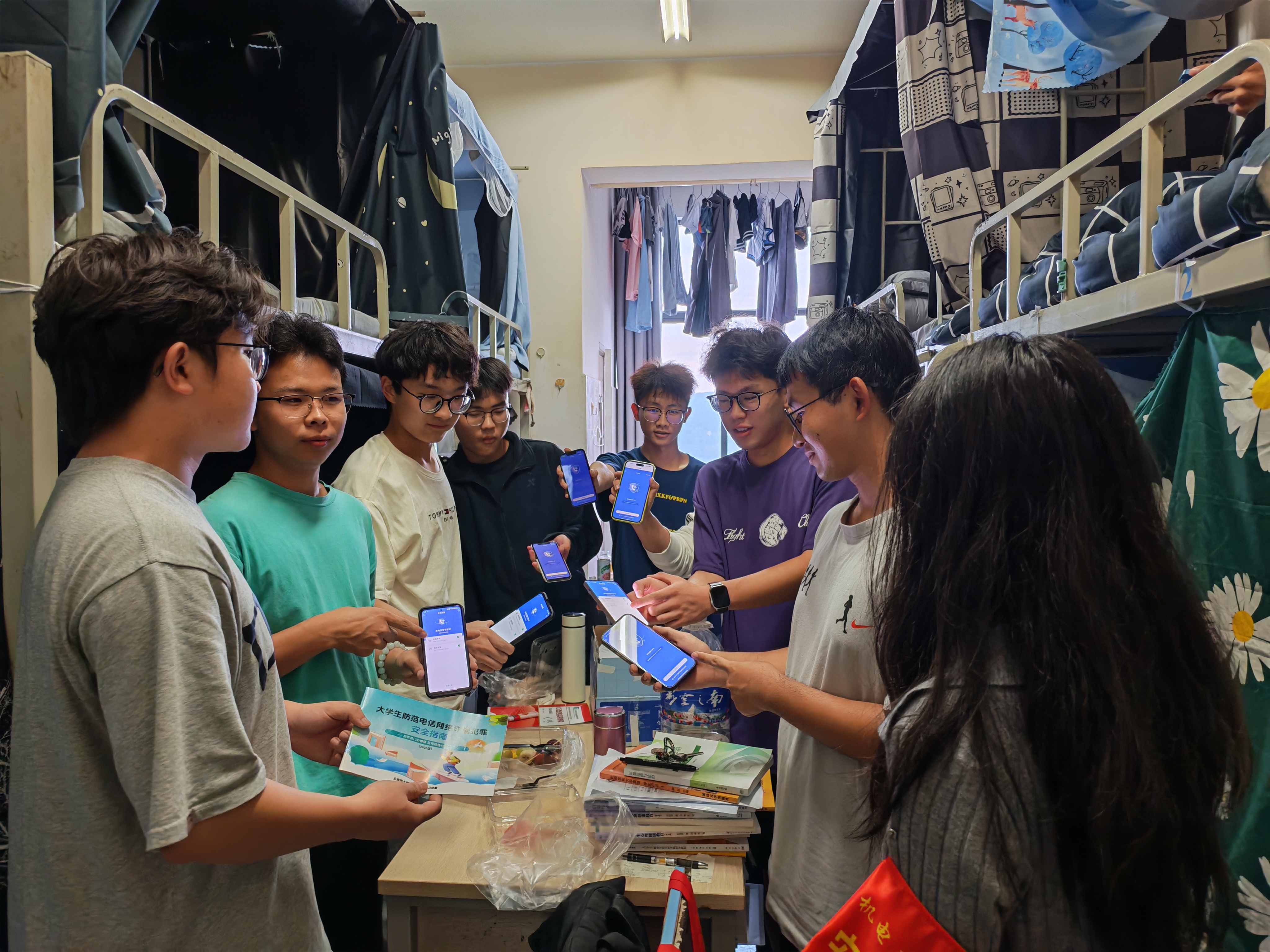 启动仪式后,志愿者小分队立即行动,与辅导员老师们一同深入宿舍,面向全体住宿生,逐一核查“国家反诈中心APP”的安装情况,并现场指导操作使用,结合真实案例讲解诈骗识别技巧。
