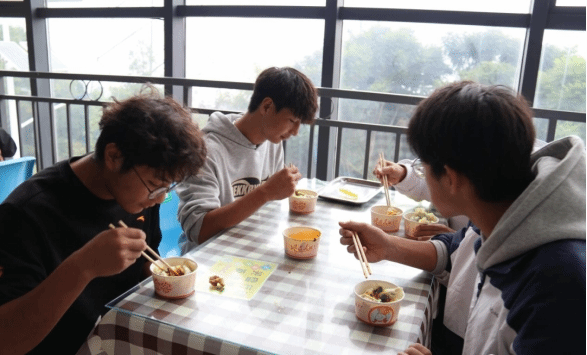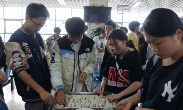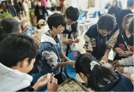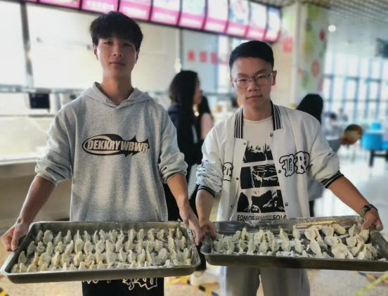 上午十一点,师生欢聚食堂,待食堂工作人员将准备好的食材一一摆放上桌后,师生齐上阵,有的撸起袖子加入包饺子的大阵营中,有的在做督导员,有的在创新各式各样的饺子,有的在切磋手艺,有的在拍照留念,师生同乐的暖意沁人心脾。随后,在大家的满心期待下,热腾腾的饺子出锅了,吃着自己亲手包的饺子,享受着自己的劳动果实,心中充斥着甜蜜,脸上洋溢着笑容。