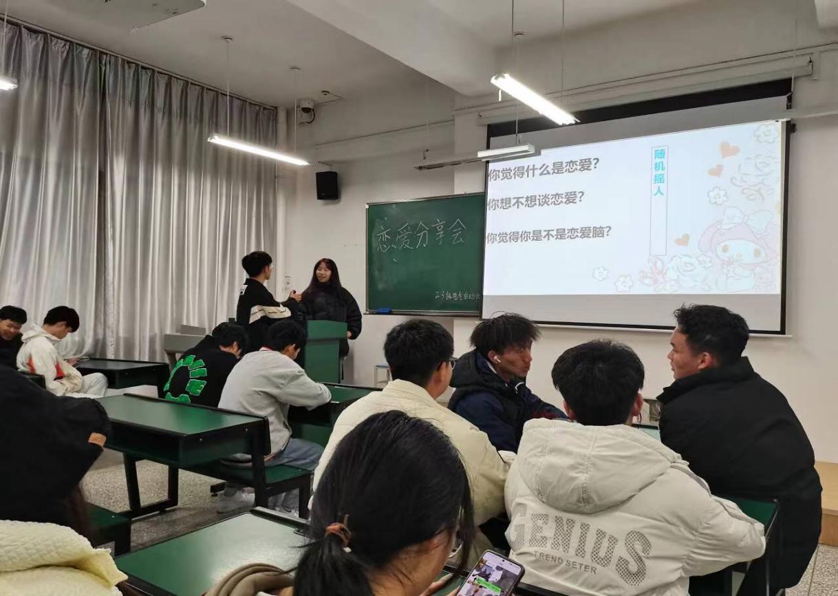 恋爱一直是大学生非常感兴趣的话题。本学期,结合大学生心理健康教育的内容,班级组织了恋爱分享会。活动依始,同学们自由讨论并分享对恋爱的看法,然后观看了恋爱心理的短片。最后,由坠入爱河的同学来分享他们的恋爱历程。作为新时代的栋梁,大学生应该有志同道合的恋爱观,建立更加成熟、稳定的关系,实现真正的爱情。