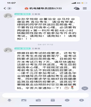 因疫情防控工作要求,本次专升本考试在工作的过程中,学院收到的临时通知较多,摸排学生信息多而急。学院多次组织召开2019级辅导员专项工作会议,要求大家全身心投入、全方位育人,向所有同学及时宣传党和国家疫情防控各项政策和举措,严格落实学校、学院疫情防控工作部署要求,着力守护学生健康安全,传递温暖与力量。