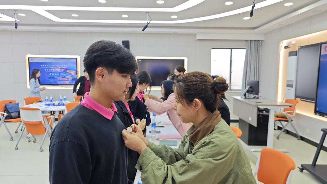 与会领导为学员代表佩戴校徽。
